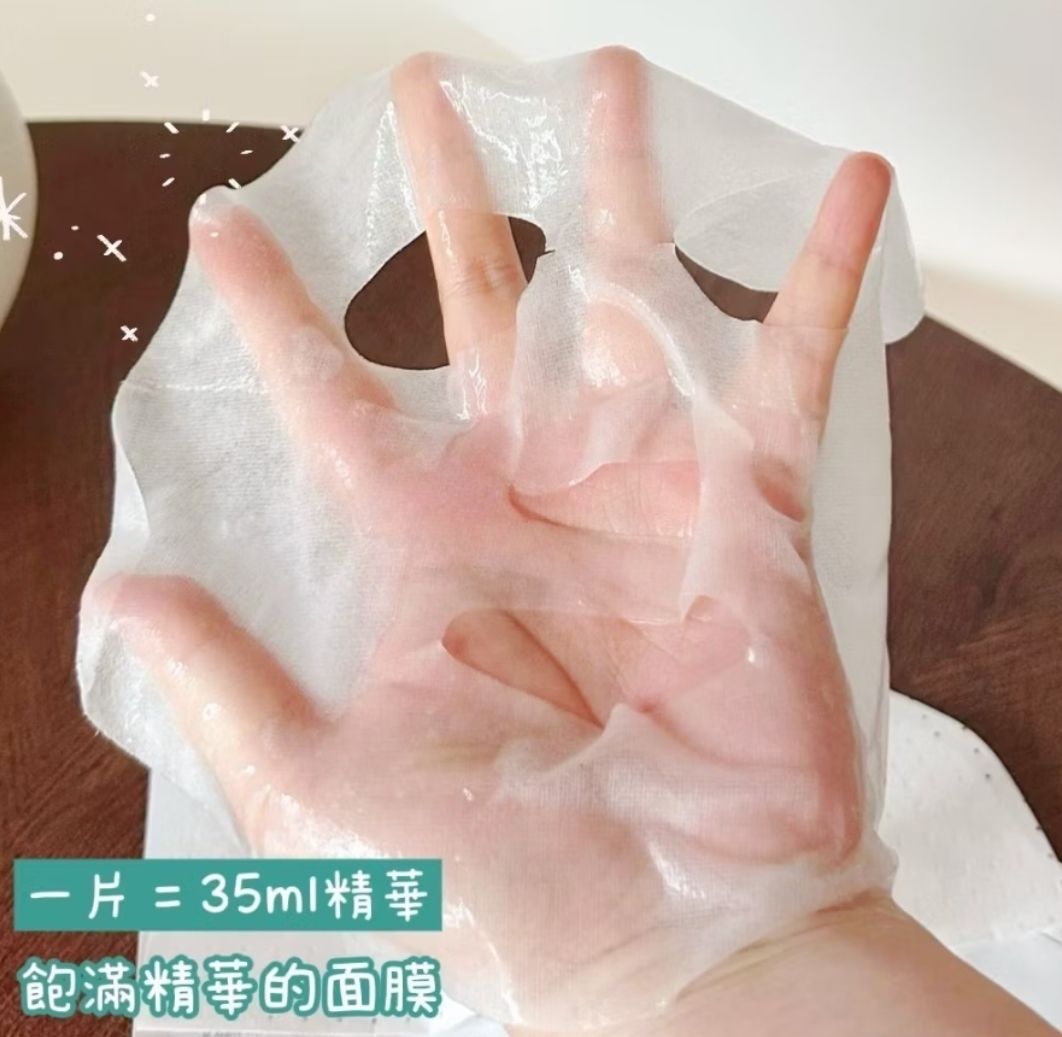 質地方面,選用的是服貼親膚的天絲布膜,薄但不易破,精華液也很飽滿,敷完不會黏黏悶悶,反而會覺得整臉都在喝水、透氣又舒爽。