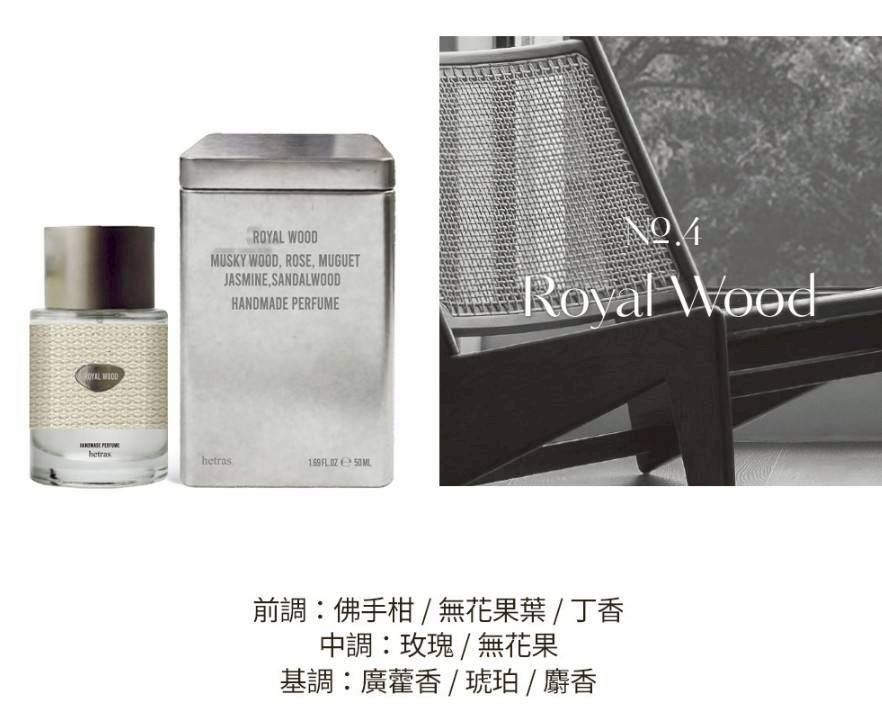 <4> Royal Wood 木質沉穩中帶著玫瑰和茉莉,溫柔卻有深度,特別適合秋冬或夜晚,走到哪都散發一種安定與高級感。