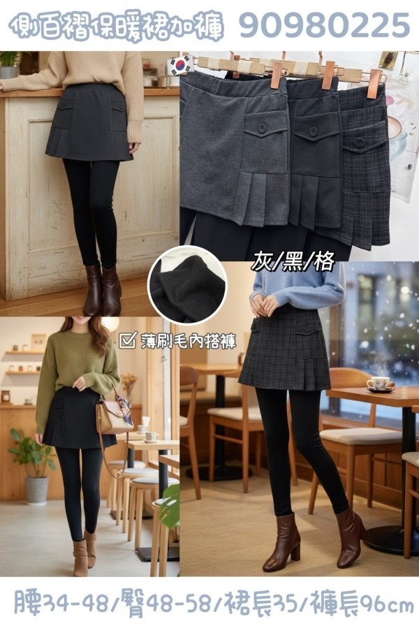 尺寸參考 (平量): 腰 34-48 / 臀 48-58 / 裙長 35 / 褲長 96 (公分)