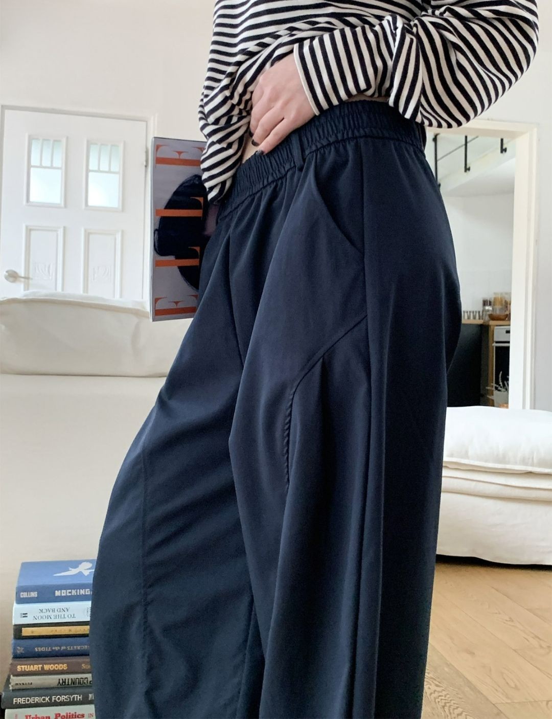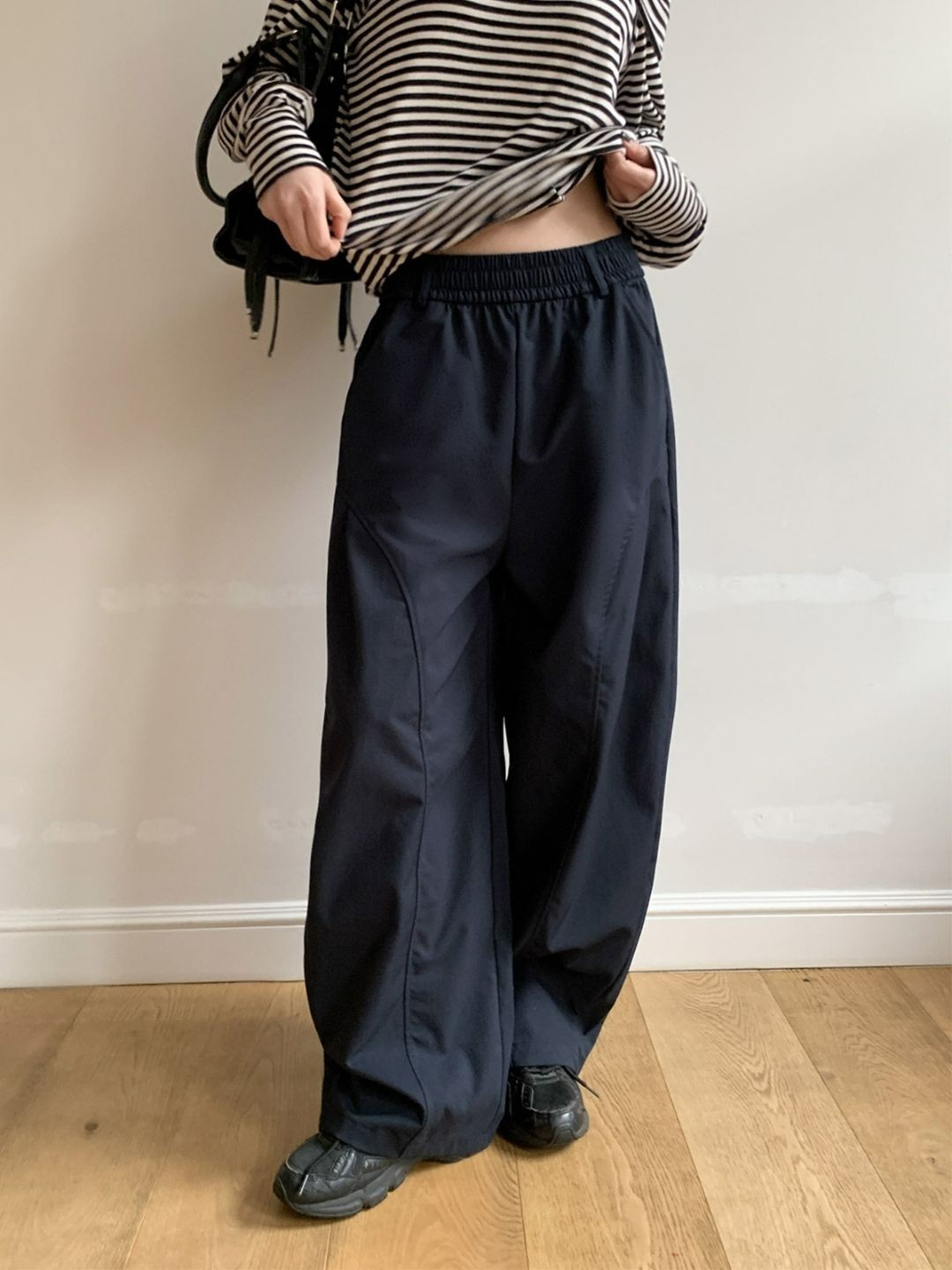 走路的時候褲型會自然垂下來,看起來很有質感,不會像一般寬褲那樣軟塌。