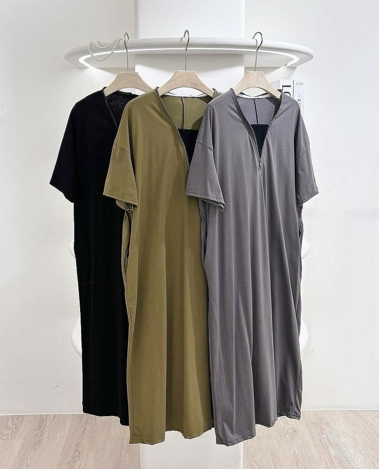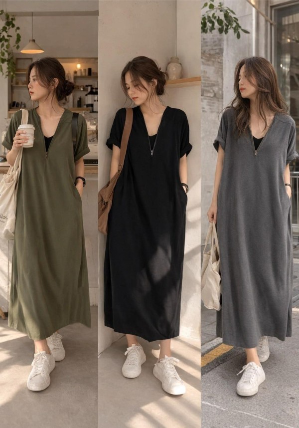韓妞 慵懶假兩件V領拉鍊長洋